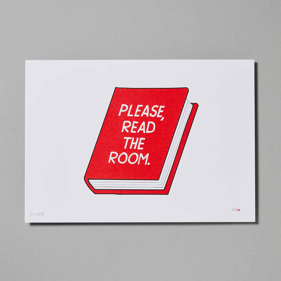 The latest print in Diego's incredibly popular book series. This little red book reminds us to read the room. Which is both a great message to promote reading as well as self awareness. So it is perfect edition for an avid reader or the socially conscious (or unconscious) book worm in your life.